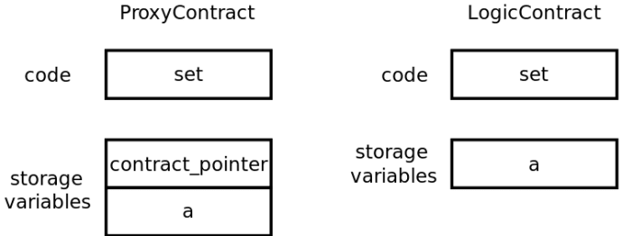 - The first element for ProxyContract is contract_pointer. As a result, LogicContract.set will write the ProxyContract.contract_pointer variable instead of ProxyContract.a